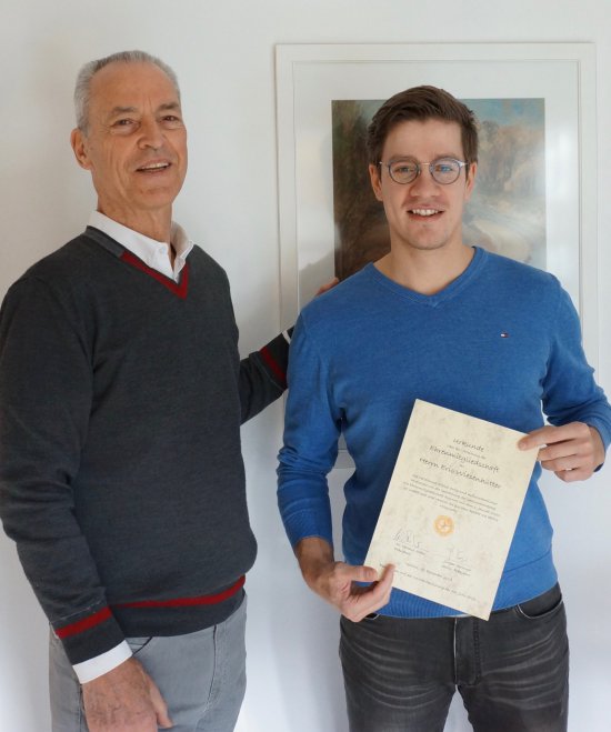 Dafür wurde ihm auf Beschluss des Vorstandes die Ehrenmitgliedschaft in unserem Verein verliehen. Die entsprechende Urkunde wurde ihm am 25.12.2019 vom Präsidenten Helmut Stahr übergeben.